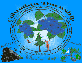 A blue flag, fading to very light blue in the center, with a large central image of clusters of blueberries, encircled by the motto and the name above, in the lower hoist a railroad engine, in the lower right ducks and geese in a pond.