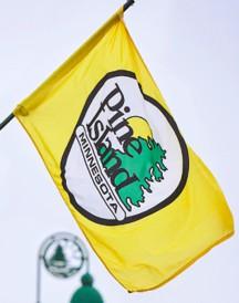 The flag is a yellow field with the town logo in the center.