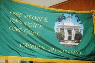 Canton has now a flag, made of a green field with a golden fringe and charged with the image of the courthouse near the fly. On the courthouse's left is placed the motto "One people / One voice / One goal", in yellow letters. Below the courthouse is placed the writing "CANTON, MISSISSIPPI", in yellow letters, too. The design of the city flag was promoted by Mayor William Truly, after he had realized that the city has no flag. The Board of Aldermen nanimously voted in favor of the flag. Green represents and golden yellow represents the city's success, achievements and prosperity. The year the city was founded, 1836, may be added in a corner of future flags.