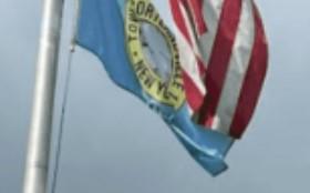 The Cortlandville Fire Department flag is white with the shoulder sleeve insignia in the center, and has red fringes.