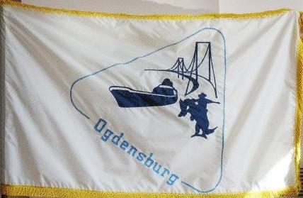 A white flag with the city logo centered in navy blue and white, showing a ship, a trapper and a bridge, all inside a triangle.