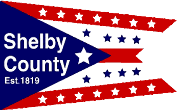 In honor of the 200th birthday of the State of Ohio, this flag was designed to reflect upon the geography of Shelby County. Its shape is a burgee in the pattern of the Ohio State Flag. The red and white stripes are symbolic of the county's many roadways and waterways, including the Miami-Erie Canal. The blue field represents the rich, fertile land from which our ancestors once thrived, and which continues to be a vital part of our livelihood. The large white star stands for the county seat Sydney, the only city in the county. The white outer stars on the red background represent the fourteen townships, while the blue stars on the white background signify the county's eight incorporated villages.
