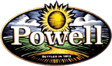 A lying ellipse filled with a landscape depicted in thick black strokes surrounding colored areas showing a yellow road ahead between green rolling hills under a blue sky with some fluffy white clouds; over all the the inscription "Powell", set in large slab serif white letters, and on a black elongated ellipse on the road the inscription "Settled in 1813", set in sans serif capitals. At www.ci.powell.oh.us/files/subdivision_map.pdf is a quite detailed depiction of this logo.