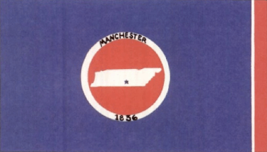 The flag of Manchester was chosen in a competition held in May 1986. The winning entry was designed by Kevin Seals, a student at Central High School. The flag follows the theme of the Tennessee flag, with the red and blue colors reversed. In the red disc the three stars of Tennessee are replaced by a white silhouette map of the state, with a small blue star indicating the geographic location of Manchester. The white circle separating the red disc from the blue field displays the name "Manchester" and the state "1836."