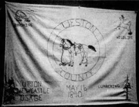 It is known a county flag was discovered in 1985; there was speculation it was part of a student's history project years prior and may not have been an officially used county flag. It depicts in its center what appeared to be the county seal over a white field; reading WESTON COUNTY in its outer ring. The center depicted a horse. Each corner depicted an item with text underneath: the upper-left depicted a cow and the word RANCHING; the upper-right depicted a deer and the word WILDLIFE; the lower-left read UPTON NEWCASTLE OSAGE (and presumably had an animal like an eagle?); the lower-right depicted a tree and the word LUMBERING. Underneath the seal is the date MAY 16, 1890; the (perhaps incorrect) date of its establishment.