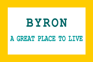Is that really a *flag*???" It is a grey field with blue capital letters, reading: BYRON / A GOOD PLACE TO LIVE. And that's *it*. No graphic, no colors except the gray and blue. It looks like a road sign by the highway, copied on