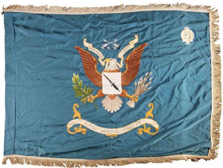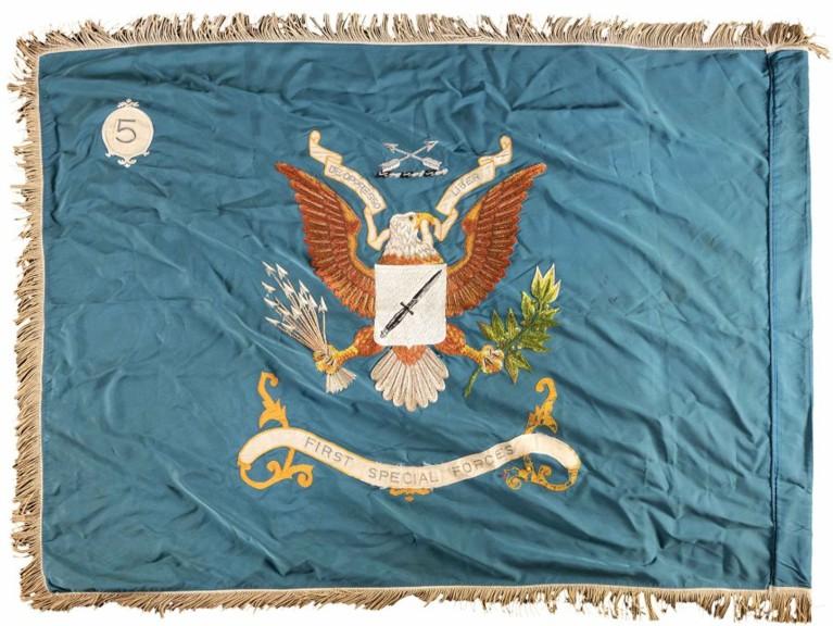 A 2-sided flag measuring approximately 52" x 40", including the 2 1/4" gold fringe that surrounds 3 sides, for the U.S. "5th Special Forces Group". The flag has a green[ish blue] body with a beautifully embroidered American Eagle displaying a ribbon in its beak the reads "DE OPPRESS LIBER" and a ribbon below that reads "FIRST SPECIAL FORCES". The gorgeous polychromatic eagle has a large white shield on its chest bearing a WWII era OSS stiletto. Above the eagle, are crossed arrows over a black and white rope. The robust American Eagle grasps 13 arrows in one talon and a large gracefully articulated olive branch in the other. The upper left corner has a circle enclosing a "5" denoting the 5th SFG. This flag traveled to Vietnam with the 5th SFG and remained in country until 1971. There is a hidden flagpole sleeve at the non-fringe side. (photo: Poulin Auctions)