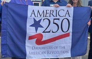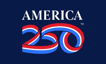 The flag is a blue horizontal flag with the logo in the middle and it is an all-caps, black serif font that says “America,” above a “250”, depicted as a red, white, and blue striped ribbon. The design’s ribbons are intended to evoke a sense of commemoration, celebration, and purpose while the flowing red, white, and blue ribbons form the number 250 as a single continuous path, representing unity, cooperation, and harmony.
