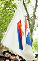 Yale was established in 1701 as the Collegiate School and renamed Yale College, after Elihu Yale, in 1718. It is the third oldest university in the U.S., after Harvard and Virginia's College of William and Mary. It became Yale University in 1887, with the name Yale College maintained (as at Harvard) for the undergraduate element. The arms are Azure an open book proper inscribed in Hebrew characters "Urim v'Thummim" (Light and Truth). These arms date back to 1736. Yale formerly flew a blue flag with its name in white block letters but now has a banner of its arms (see photograph; it is the farthest to the viewer's right of the four flags on the stage; I think the white one with blue seal between this and the Connecticut flag must be that of the city of New Haven.) As has been previously discussed on the list, Yale blue is very dark--approximately the same as the blue on the stars and stripes. In addition, Yale College and the schools and residential colleges use banners of their own distinctive arms or the arms on a blue or white field, as seen in the picture mentioned above.