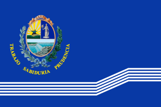 Through a public call, the Flag of Salto was created, which through unanimity of the members of the jury designated for that purpose, they resolved that the same would be presented to the Lt. Colonel Carlos Alfredo Etchevers Vianna. The Departmental Junta granted the approval through Decree 5.919/97 on 31 July 1997. The 1st of August of the same year, the corresponding to be achieved was signed by the Departmental Executive. It is composed of a panel whose fly is 1.5 times greater than its hoist. On a sky-blue field, it bears the complete Coat of Arms of Salto, placed along its vertical axis at a distance proportional to 3.5 parts of the flag’s length, measured from the hoist toward the fly, and along its horizontal axis at a distance proportional to 3.1 parts of the height, measured from the top edge downward. Under the Coat of Arms, adopting the form in a curved sector the words "Trabajo - Sabiduría - Prudencia" [Work - Knowledge - Prudence] with the type of letters appropriately in gold yellow color. In the lower third of the flag in horizontal form, there are five white triangles, each with a width of one-sixth of the hoist. They extend from the hoist to the fly, forming a 45° angle along three-fifths of their length, continuing at that angle up to four-fifths, and returning to horizontal in the last fifth.