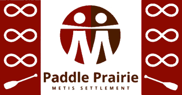 Paddle Prairie Metis Settlement has a new flag, probably from 2022 or 2023. It now has 6 Métis symbols and two paddles, and the name is entirely below the logo.