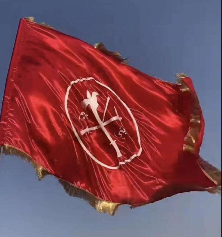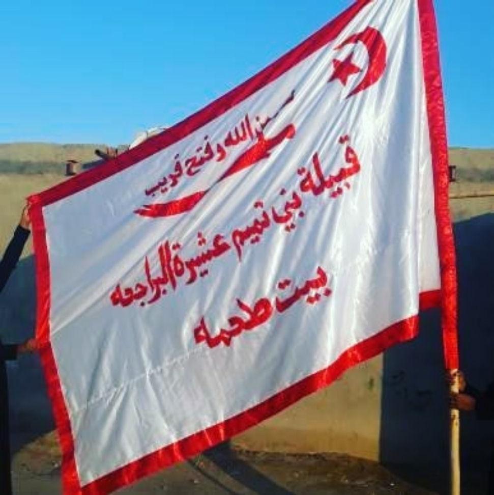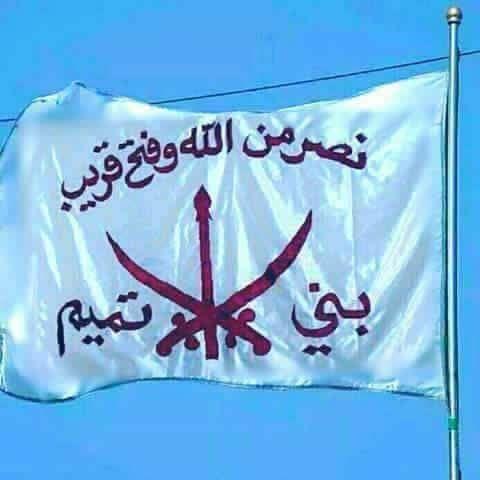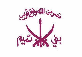 Among the variants of flags seen, the oldest have the arms and the inscription "Victory from God has fallen upon the prey" and "Banu Tamim" in red on a white background. The most recent have just the arms, with Banu Tamim written, surrounded by a circle, in white or yellow on a red background.