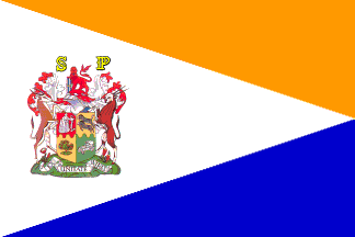 by Mark Sensen, 20 May 2002The first South African Presidential flag, like its predecessor, was blue and in place of the Royal Crest bore the embellished version of the South African coat of arms in full colour in the centre, ensigned with the letters SP in gold. Unlike the former flag of the Governor-General, this flag had the proportion of 2:3 like the national flag.